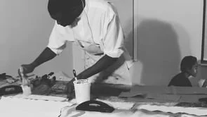 Troy Hul Arnold in his then Bronx New York Studio, seen here in the process of hand making an HUL ARNOLD TOTE BAG. Troy fully hand coats the outer textured surface of the re-claimed duck canvas before the cut & sew process.